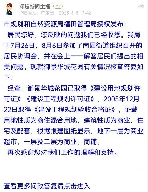 (三)關(guān)于“消防、環(huán)保、安全”等問題:經(jīng)向相關(guān)部門了解,該項目尚未進入相關(guān)的規(guī)劃變更、環(huán)保備案及消防審批等程序,街道已于8月6日再次就規(guī)劃、消防等問題約談龍勝公司負責(zé)人,負責(zé)人表示改建電子市場目前仍處于規(guī)劃階段,公司已暫時停止實施該商業(yè)項目。