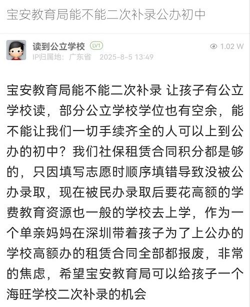 9. 帖文《寶安教育局能不能二次補錄公辦初中》