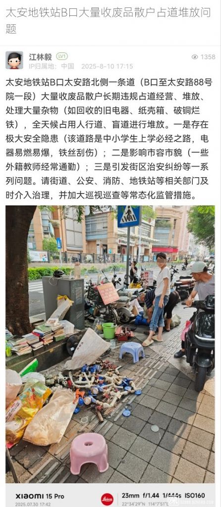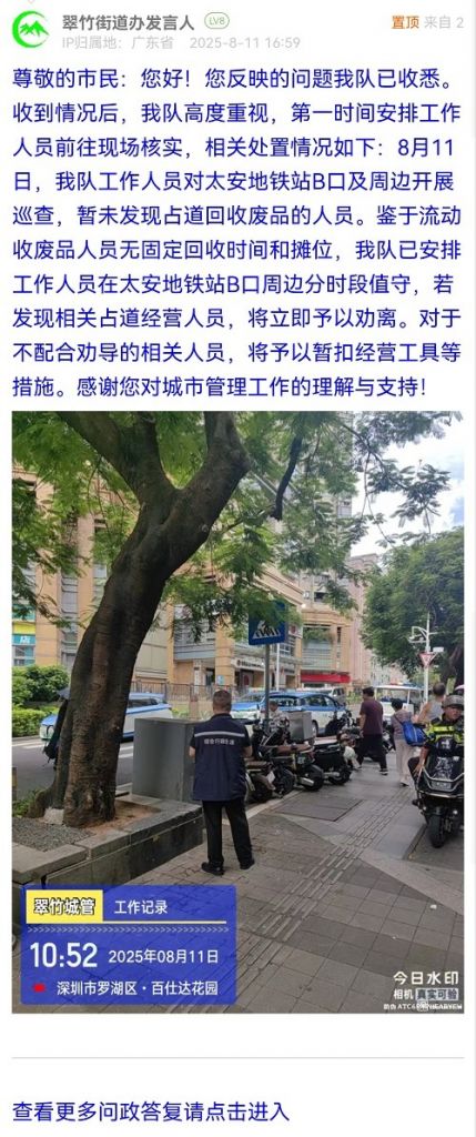 尊敬的市民:您好!您反映的問題我隊已收悉。收到情況后,我隊高度重視,第一時間安排工作人員前往現(xiàn)場核實,相關(guān)處置情況如下:8月11日,我隊工作人員對太安地鐵站B口及周邊開展巡查,暫未發(fā)現(xiàn)占道回收廢品的人員。鑒于流動收廢品人員無固定回收時間和攤位,我隊已安排工作人員在太安地鐵站B口周邊分時段值守,若發(fā)現(xiàn)相關(guān)占道經(jīng)營人員,將立即予以勸離。對于不配合勸導(dǎo)的相關(guān)人員,將予以暫扣經(jīng)營工具等措施。感謝您對城市管理工作的理解與支持!