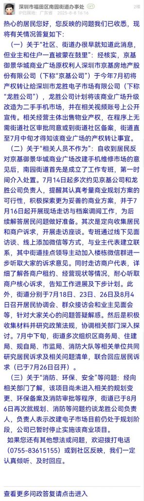 (二)關(guān)于“相關(guān)人員不作為”:自收到居民反對京基御景華城商業(yè)廣場改建手機維修市場的意見后,南園街道首先是成立了工作專班,第一時間介入處置。7月14日起多次約見京基公司和龍勝公司負責(zé)人,提醒其認真考量商業(yè)規(guī)劃方案的可行性,積極探索更為妥善的商業(yè)方案,并于7月16日起開展現(xiàn)場走訪與檔案調(diào)閱工作,為后續(xù)解答居民問題做好準備。其次是定向收集居民和商戶訴求,開展走訪座談。專班通過線下見面訪談、線上添加微信等方式,與業(yè)主代表建立聯(lián)系,其中街道掛點領(lǐng)導(dǎo)主動加入樓棟微信群進一步聽取大家的訴求意見。同時走訪商戶代表,詳細了解各商戶租約、經(jīng)營現(xiàn)狀等情況,耐心聽取商戶核心訴求,告知工作進展及下步計劃。此外,街道分別于7月18日、23日、26日及8月4日召開居民協(xié)調(diào)會、群眾接訪會和業(yè)主見面會等,針對大家關(guān)心的問題答疑解惑。然后是積極收集材料并研究政策法規(guī),協(xié)調(diào)相關(guān)部門深入探討。7月中下旬,街道多次組織區(qū)商務(wù)局、住建局、規(guī)自局、市監(jiān)局、消防大隊等相關(guān)單位共同研究居民訴求及相關(guān)問題清單,聯(lián)合回應(yīng)居民訴求(已于7月26日召開)。