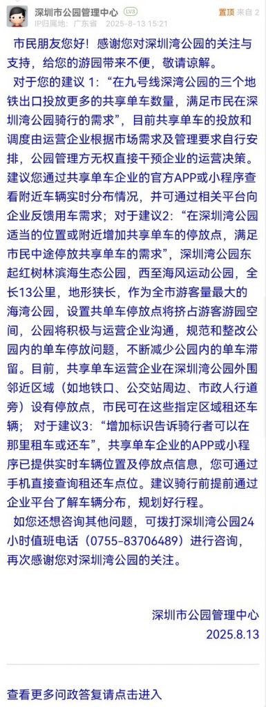 對于您的建議 1:“在九號線深灣公園的三個地鐵出口投放更多的共享單車數(shù)量,滿足市民在深圳灣公園騎行的需求”,目前共享單車的投放和調(diào)度由運營企業(yè)根據(jù)市場需求及管理要求自行安排,公園管理方無權(quán)直接干預(yù)企業(yè)的運營決策。建議您通過共享單車企業(yè)的官方APP或小程序查看附近車輛實時分布情況,并可通過相關(guān)平臺向企業(yè)反饋用車需求;對于建議2:“在深圳灣公園適當(dāng)?shù)奈恢没蚋浇黾庸蚕韱诬嚨耐7劈c,滿足市民中途停放共享單車的需求”,深圳灣公園東起紅樹林濱海生態(tài)公園,西至海風(fēng)運動公園,全長13公里,地形狹長,作為全市游客量最大的海灣公園,設(shè)置共單車停放點將擠占游客游園空間,公園將積極與運營企業(yè)溝通,規(guī)范和整改公園內(nèi)的單車停放問題,不斷減少公園內(nèi)的單車滯留。目前,共享單車運營企業(yè)在深圳灣公園外圍鄰近區(qū)域(如地鐵口、公交站周邊、市政人行道旁)設(shè)有停放點,市民可在這些指定區(qū)域租還車輛; 對于建議3:“增加標識告訴騎行者可以在那里租車或還車”,共享單車企業(yè)的APP或小程序已提供實時車輛位置及停放點信息,您可通過手機直接查詢租還車點位。建議騎行前提前通過企業(yè)平臺了解車輛分布,規(guī)劃好行程。