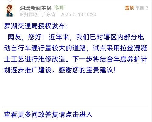 網(wǎng)友,您好!近年來,我們已對轄區(qū)內(nèi)部分電動自行車通行量較大的道路,試點采用拉絲混凝土工藝進行維修改造。下一步將結(jié)合年度養(yǎng)護計劃逐步推廣建設(shè)。感謝您的寶貴建議!