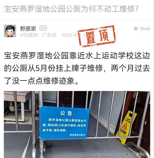 11. 帖文《寶安燕羅濕地公園公廁為何不動工維修?》