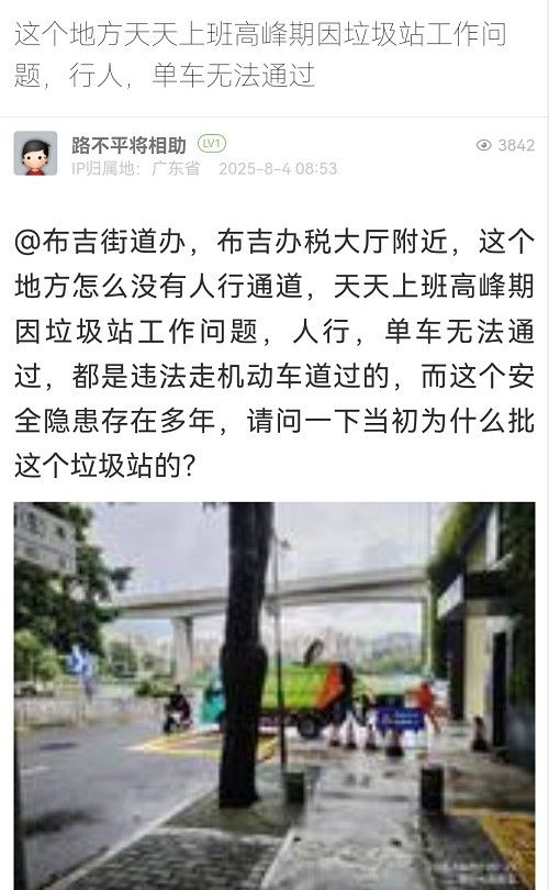 1. 帖文《這個地方天天上班高峰期因垃圾站工作問題,行人,單車無法通過》