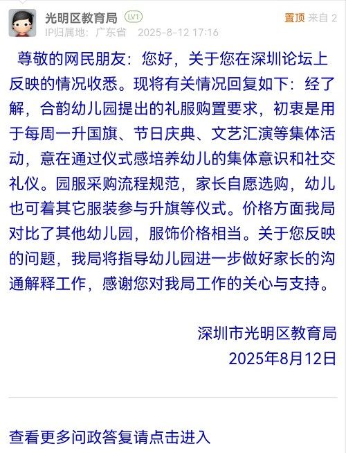 尊敬的網(wǎng)民朋友:您好,關(guān)于您在深圳論壇上反映的情況收悉。現(xiàn)將有關(guān)情況回復(fù)如下:經(jīng)了解,合韻幼兒園提出的禮服購置要求,初衷是用于每周一升國旗、節(jié)日慶典、文藝匯演等集體活動,意在通過儀式感培養(yǎng)幼兒的集體意識和社交禮儀。園服采購流程規(guī)范,家長自愿選購,幼兒也可著其它服裝參與升旗等儀式。價格方面我局對比了其他幼兒園,服飾價格相當(dāng)。關(guān)于您反映的問題,我局將指導(dǎo)幼兒園進一步做好家長的溝通解釋工作,感謝您對我局工作的關(guān)心與支持。