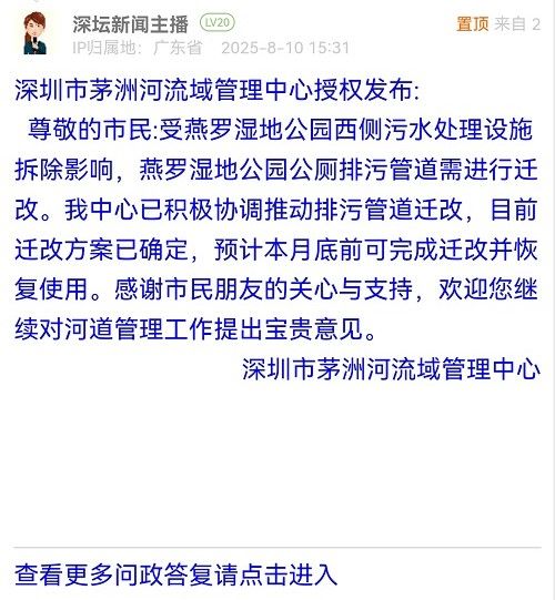 尊敬的市民:受燕羅濕地公園西側(cè)污水處理設(shè)施拆除影響,燕羅濕地公園公廁排污管道需進行遷改。我中心已積極協(xié)調(diào)推動排污管道遷改,目前遷改方案已確定,預(yù)計本月底前可完成遷改并恢復(fù)使用。感謝市民朋友的關(guān)心與支持,歡迎您繼續(xù)對河道管理工作提出寶貴意見。