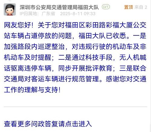網(wǎng)友您好!關(guān)于您對福田區(qū)彩田路彩福大廈公交站車輛占道停放的問題,福田大隊已收悉。一是加強路段內(nèi)巡邏整治,對違規(guī)行駛的機動車及非機動車及時提醒;二是通過科技手段,無人機喊話驅(qū)離違停車輛,同步開展批評教育;三是聯(lián)合交通局對客運車輛進行規(guī)范管理。感謝您對交通工作的理解與支持!