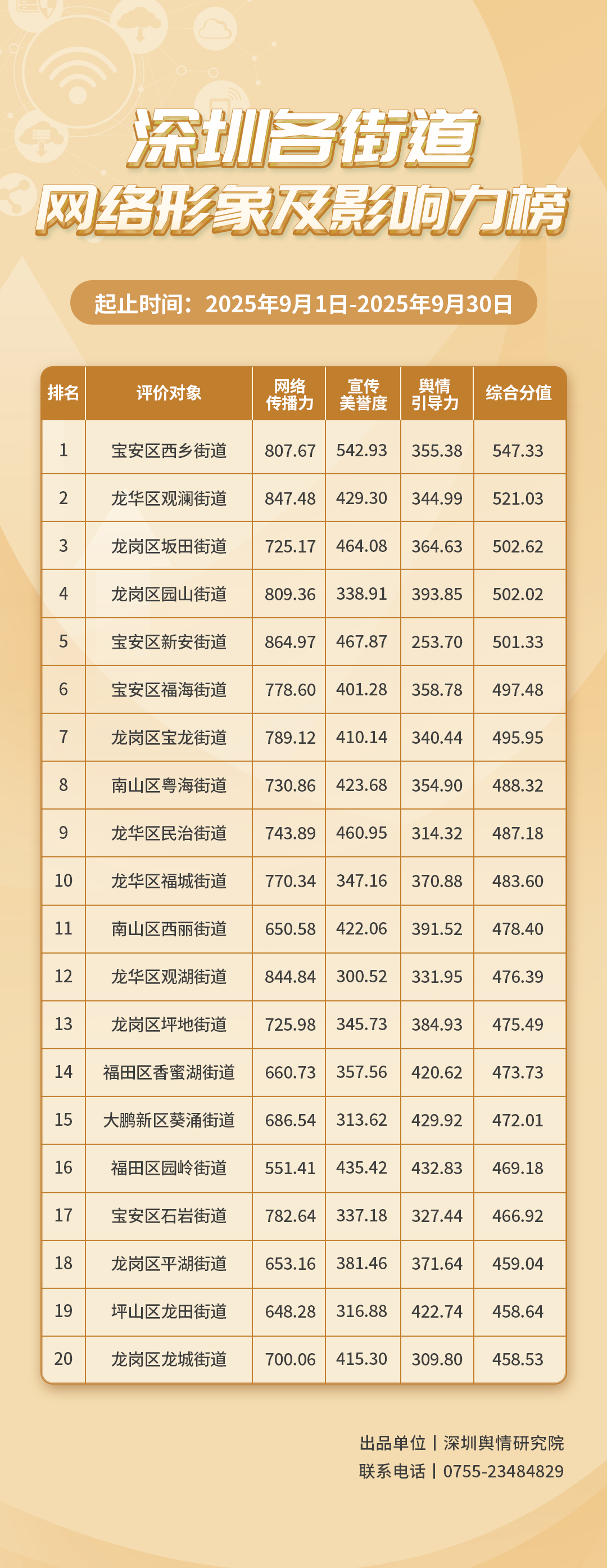 2025年9月,共有20個(gè)街道登上《深圳各街道網(wǎng)絡(luò)形象及影響力榜》,分別是:寶安區(qū)西鄉(xiāng)街道、龍華區(qū)觀瀾街道、龍崗區(qū)坂田街道、龍崗區(qū)園山街道、寶安區(qū)新安街道、寶安區(qū)福海街道、龍崗區(qū)寶龍街道、南山區(qū)粵海街道、龍華區(qū)民治街道、龍華區(qū)福城街道、南山區(qū)西麗街道、龍華區(qū)觀湖街道、龍崗區(qū)坪地街道、福田區(qū)香蜜湖街道、大鵬新區(qū)葵涌街道、福田區(qū)園嶺街道、寶安區(qū)石巖街道、龍崗區(qū)平湖街道、坪山區(qū)龍?zhí)锝值馈垗弲^(qū)龍城街道。