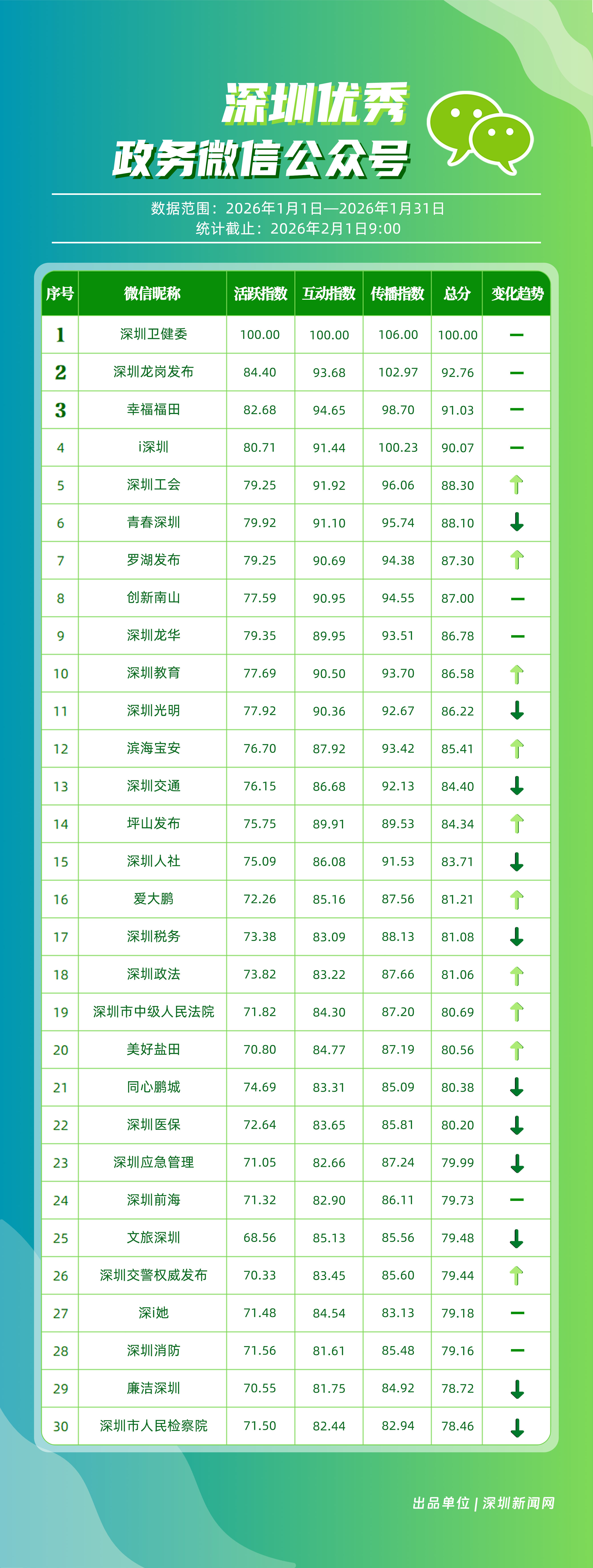 2026年1月,“深圳衛(wèi)健委”“深圳龍崗發(fā)布”“幸福福田”“i深圳”“深圳工會”“青春深圳”“羅湖發(fā)布”“創(chuàng)新南山”“深圳龍華”“深圳教育”等30個(gè)政務(wù)微信公眾號榮登“深圳優(yōu)秀政務(wù)微信公眾號”榜單。1月,頭部賬號“深圳衛(wèi)健委”繼續(xù)保持領(lǐng)先優(yōu)勢,1月份有59篇文章閱讀量突破10萬次,總分100分,穩(wěn)居榜首;“深圳龍崗發(fā)布”在互動與傳播方面表現(xiàn)依然出色,總分102.97分,位列第二;“幸福福田”憑借均衡、穩(wěn)健的運(yùn)營,在互動與傳播方面表現(xiàn)優(yōu)異,總分91.03分,排名第三。同時(shí),“深圳工會”與“羅湖發(fā)布”等賬號排名相較2025年12月有所提升。上榜微信公眾號持續(xù)深耕內(nèi)容與服務(wù),不斷拓展發(fā)布維度與深化應(yīng)用場景,在提升政務(wù)信息傳播效能、精準(zhǔn)對接民生需求方面,發(fā)揮了關(guān)鍵作用。