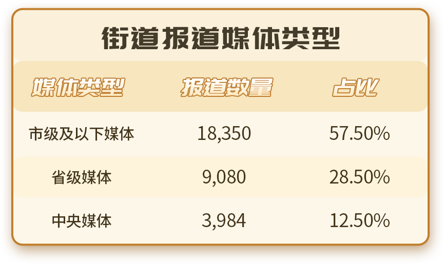 先看媒體類型,全年報(bào)道中,市級(jí)及以下媒體占比57.5%,省級(jí)媒體占比28.5%,兩者合計(jì)超過八成。也就是說,街道的大部分傳播,首先發(fā)生在區(qū)域媒體體系之中,被本地社會(huì)所看見、討論和接收。這樣的分布并不意外。街道離居民最近,日常工作也最貼近城市運(yùn)行的細(xì)部肌理,無論是基層治理、社區(qū)服務(wù),還是環(huán)境整治、民生保障,本身都帶有很強(qiáng)的屬地屬性,天然更容易進(jìn)入本地媒體的觀察視野。