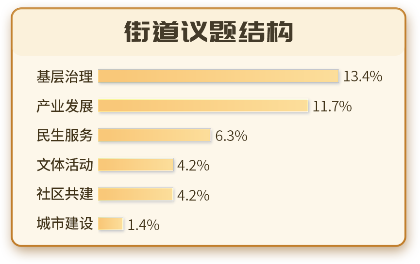 從全年報(bào)道分類情況看,基層治理以13.4%的占比居于首位,產(chǎn)業(yè)發(fā)展占比11.7%,民生服務(wù)占比6.3%,三類議題共同構(gòu)成街道傳播最主要的內(nèi)容來源。